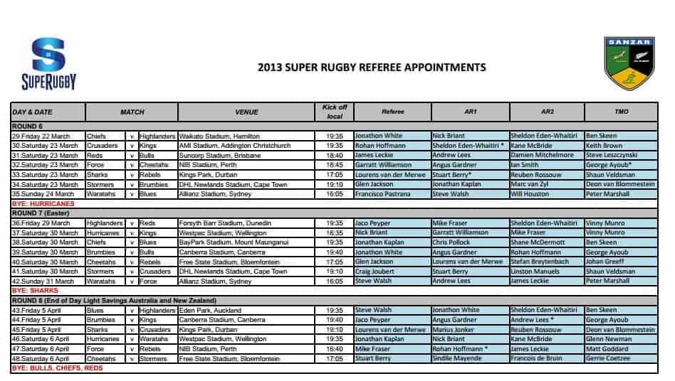 Updated appointments for rounds 6-8 of the SANZAR Super Rugby competition
