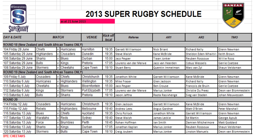 The round 18, 19 and 20 Super Rugby match official appointments have been published this morning:
